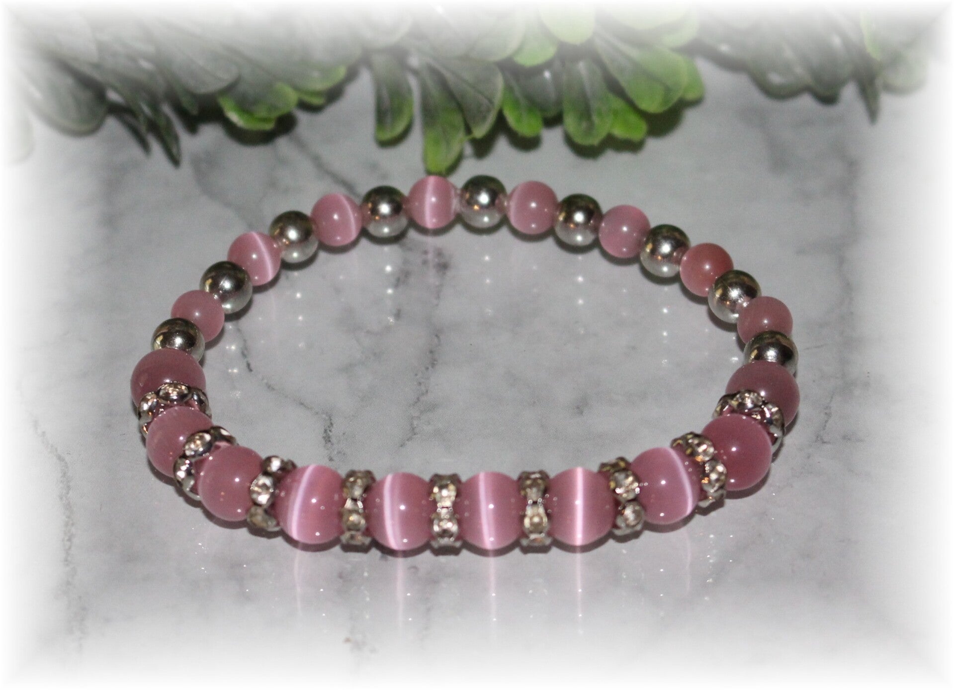 Pink cat's eye, crystal rondelles and silver bracelet 7" stretch