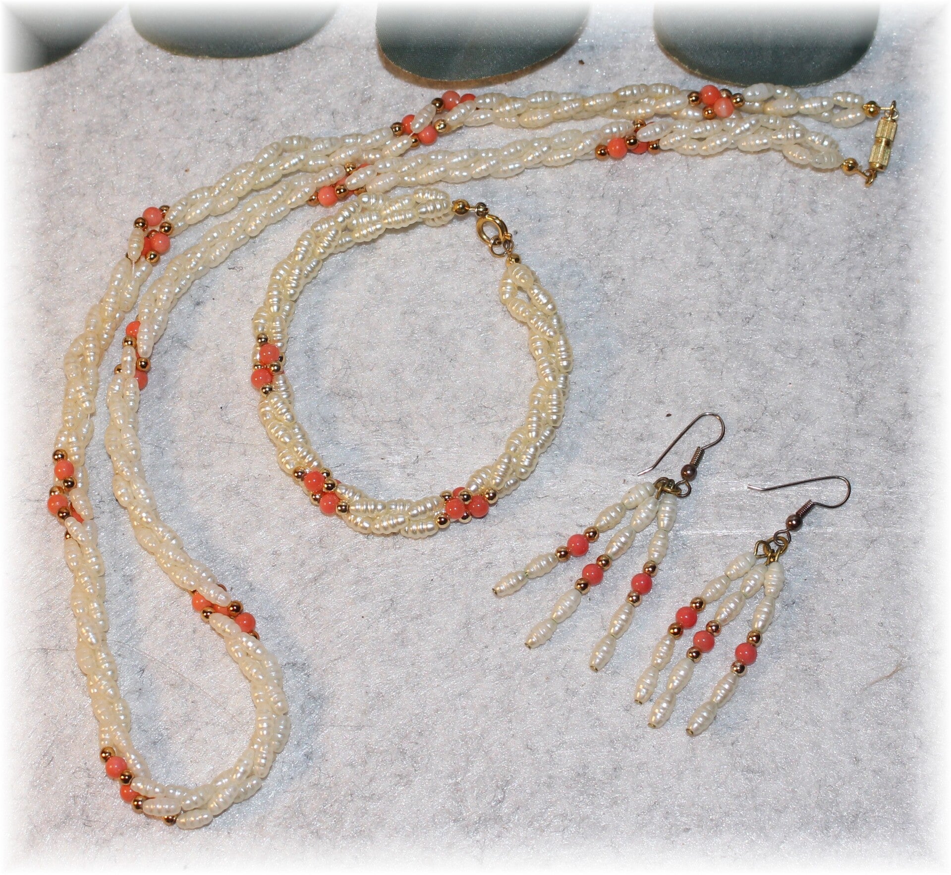Twisted White Pearl and Coral Gold Necklace 24", Bracelet 7 1/2", and Earrings Set